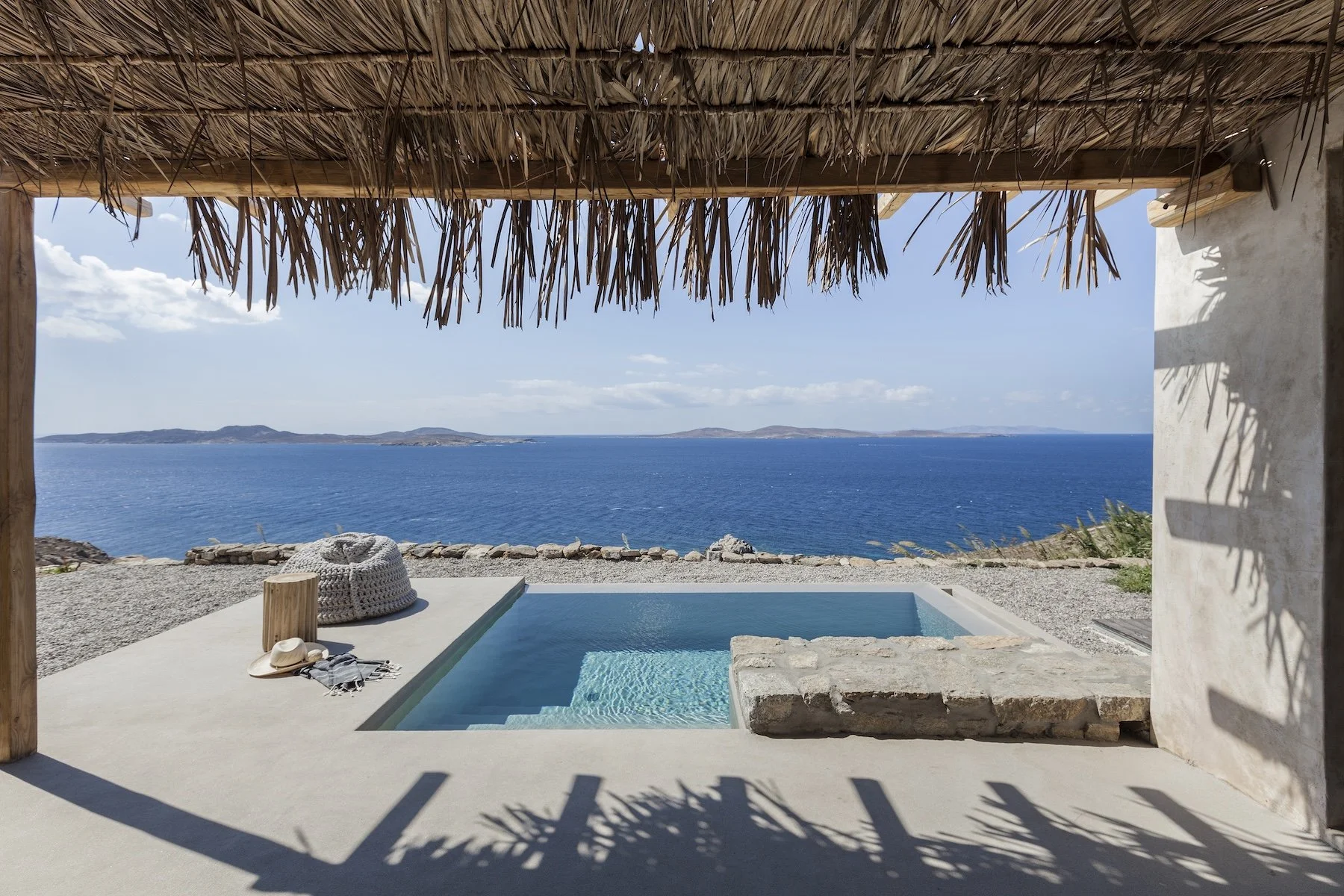 Guest house 1: double bed, [A/C] and ensuite bathroom with shower - sea view room// independent entrance Lower level: outdoor dining area [14 seats], pergola, build-in lounge area, portable BBQ, pool bar with high chairs, yard